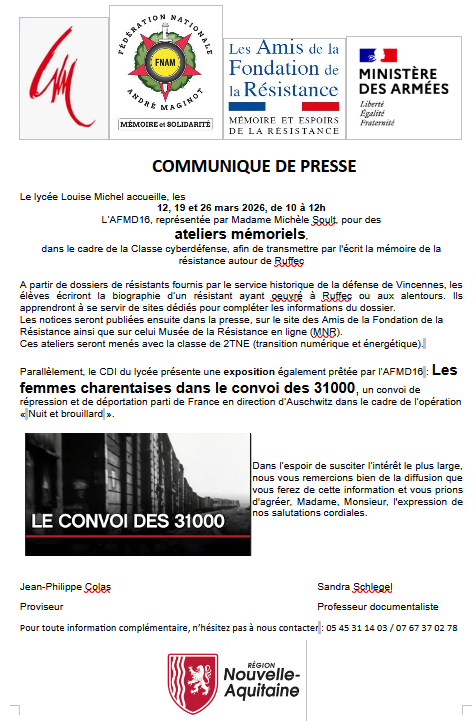 Au mois de juin 2026, lors d’un voyage programmé en Normandie, l’AFMD 16 accompagnera également les élèves de la classe de 1CIEL (cybersécurité, informatique et réseaux, électronique). Ceux-ci visiteront les plages et hauts lieux du débarquements, le musée d’Arromanches, le Mémorial de Caen et les Archives du Mémorial, sous emprise militaire. Ils feront également un atelier de recherche dans les archives qui conservent nombre de dossiers charentais entre autres, sur la résistance à Ruffec et en Charente.